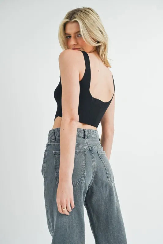 The corset design detail crop knit top is a trendy and stylish piece that features a corset-inspired design for a flattering fit. The crop length adds a modern and edgy touch to the top, perfect for pairing with high-waisted bottoms. This top is ideal for creating a fashion-forward look with its unique corset detailing, making it a versatile and statement-making addition to your wardrobe.
