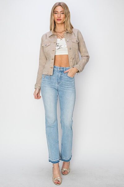 RISEN Full Size Raw Hem Button Up Cropped Denim Jacket Plus Size