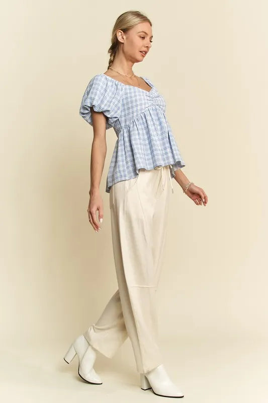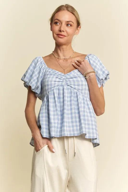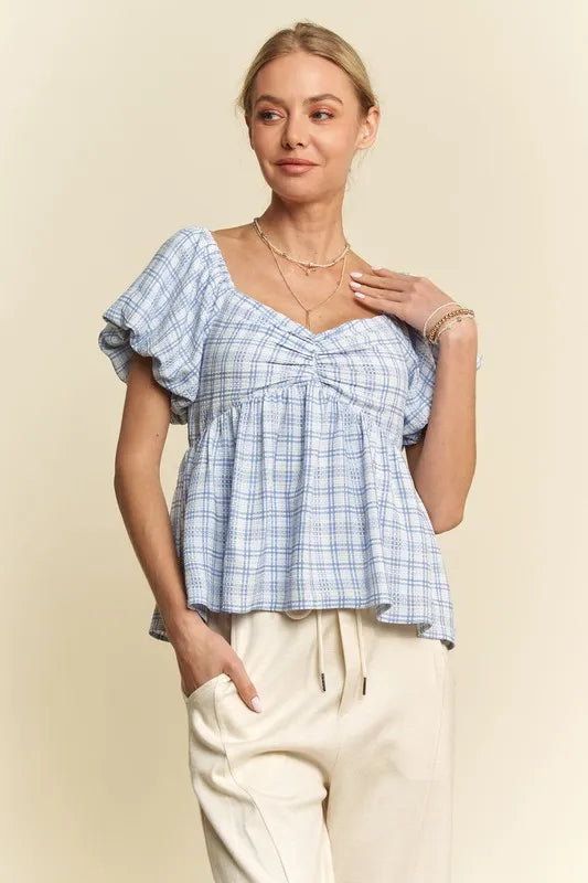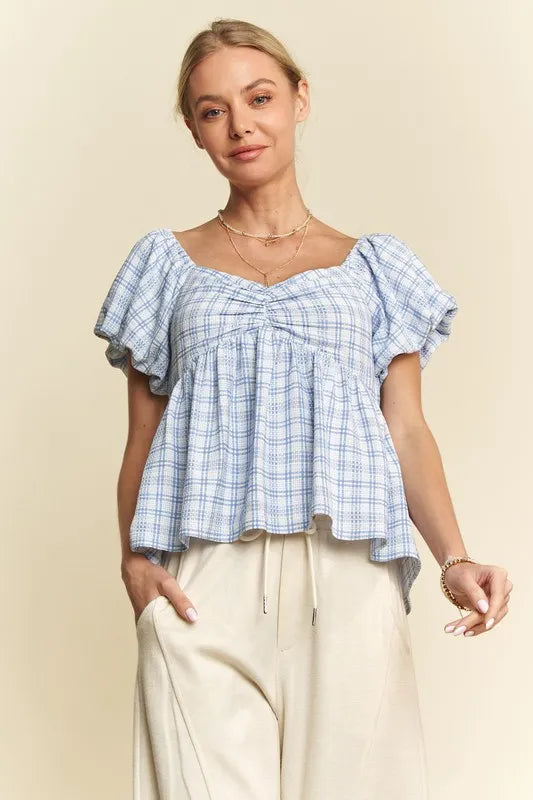 Davi & Dani Plaid Puff Sleeves Ruffled Smocked Blouse